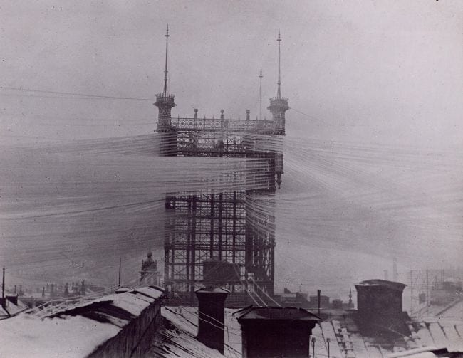 This telephone tower was one of the first, and this photo was taken in 1890. The wires couldn’t have been hidden, and they make this tower look spectacular.