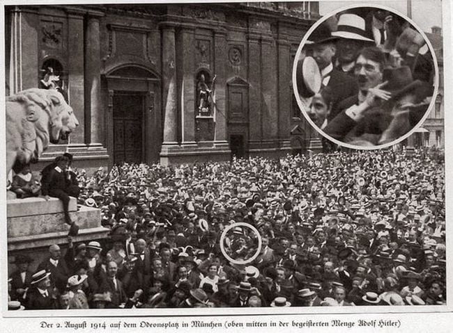 In Germany, WWI was announced in 1914 and Hitler was spotted in the crowd.