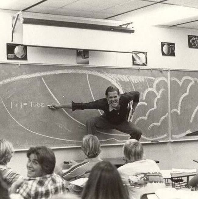 What is the best way to demonstrate the physics of surfing? Well, to surf on the desk in the classroom, according to this teacher. The photo was taken in 1970 in California.