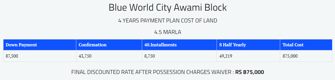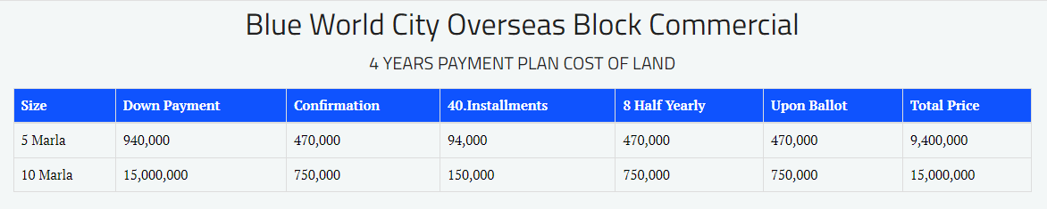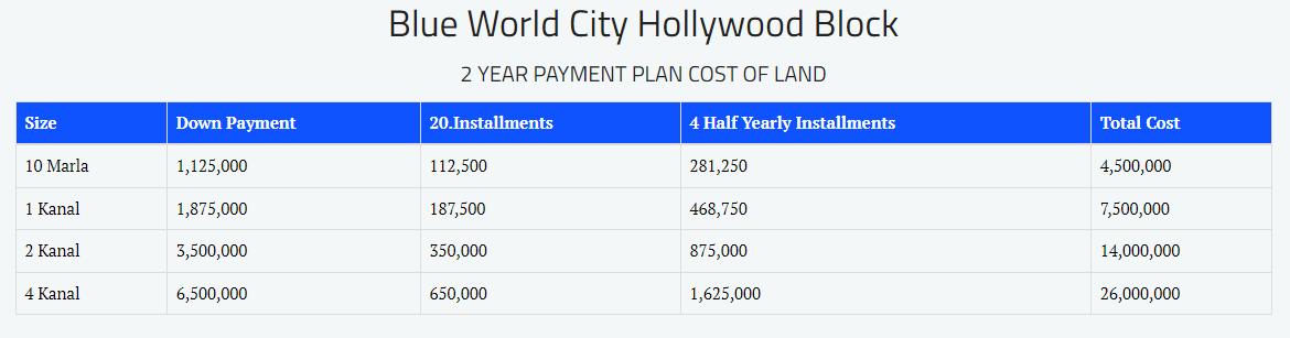 Following are the payment plans of Blue World City: