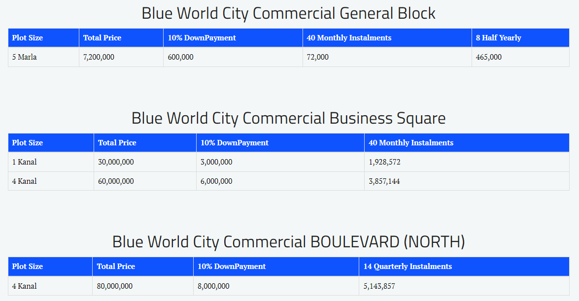 Ans. Blue World City offers residential plots in sizes ranging from 5 Marla to 2 Kanal, as well as commercial plots in various sizes.