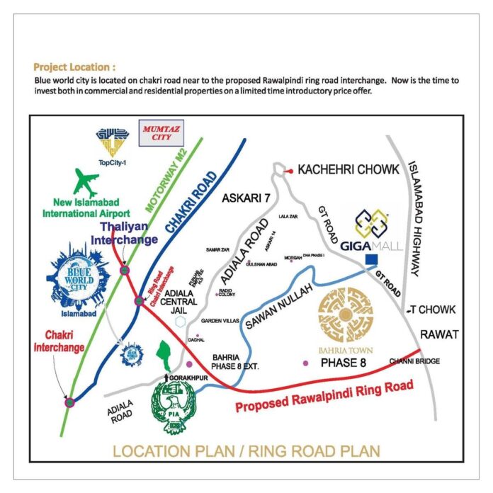 The location of Blue World City is ideally located at Chakri Road, near the Lahore-Islamabad Motorway (M2). It is situated in close proximity to the New Islamabad International Airport, making it easily accessible for residents and visitors alike.