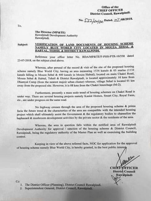 Blue World City has not obtained the necessary final approvals and No Objection Certificates (NOCs) from the relevant authorities, including the Rawalpindi Development Authority (RDA). However, preliminary permissions have been granted.