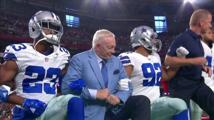 The Dallas Cowboys organization joins the protests against President Donald Trump on Monday as all the players, staff members and owner Jerry Jones knelt before the national anthem. There were boos from the crowd before both teams stood and linked arms on the sidelines.