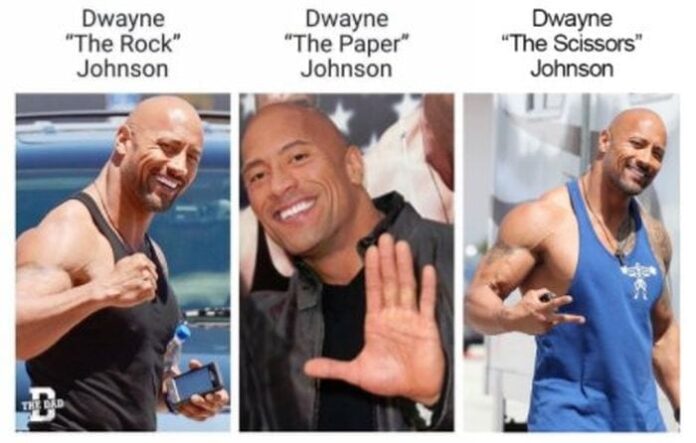 There isn’t a person that is more featured on memes and the gifs than the man still known as The Rock. The best part about this is that he enjoys it. People’s Champ is aware of how much he’s featured in various internet communities, and he has learned to appreciate it. The most recent meme that has set the Internet on fire is the one showing Rampage superstar in three different pictures posing as – Rock, Paper, and Scissors.