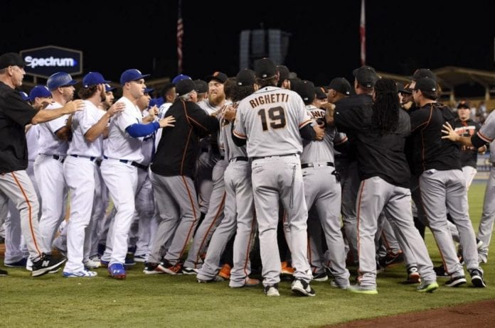 Since this is not the first time something like this is happening, it’s pretty much turning into a certain tradition! This time actors of a Monday night rumble were again Yasiel Puig and Madison Bumgarner. If you recall this is not the first time these two got into a heated argument, and last two known incidents were in May 2014 when Puig hit 431-foot home run to center field, after what Bumgarner waited for him to round up at third base to exchange a few “pleasantries.” Situation after this, of course, got a whole lot serious. Next incident between these two was in September 2014, when Bumgarner hit Puig as he was moving toward the mound. After some heated argument benches were cleared as well as bullpens and Puig had to be held down by teammates and umpire.