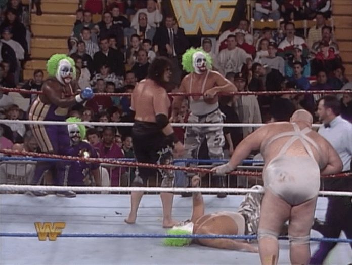 Instead of a team of four Doinks, there were Men on a Mission, and The Bushwackers dressed up as Doinks, and they were going against Bam Bam Bigelow, The Headshrinkers and Bastion Booger. The clowns managed to defeat their opponents easily. Samu was popping balloons with a bite, and one of the balloons was filled with water, so it exploded to his face. Luke rolled him up and eliminated him.